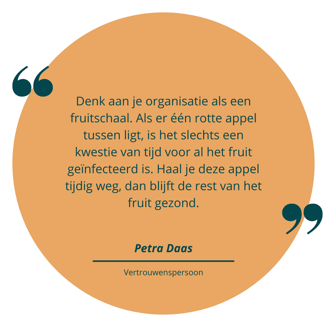 Jaarlijks krijg je als werkgever een geanonimiseerd rapport. Ook zal Petra daarbij adviseren over acties die jij zelf kunt nemen om kwesties op te lossen of de werkcultuur te verbeteren. Natuurlijk kun jij zelf ook contact opnemen wanneer je behoefte hebt aan advies of een klankbord.